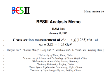近日,粒子物理团队在BESIII实验数据分析领域取得重要进展,相关研究发表在知名期刊《Physical Review D》上,题为“Cross section measurement of e^+ e^- à f_1(1285) pi^+ pi^- at center-of-mass energies between 3.808 and 4.951 GeV”(//doi.org/10.1103/567d-cv9k)。粒子物理实验论文需要整个合作组的共同努力,根据国际惯例,粒子物理实验方向发表的论文作者按姓氏字母排序,因此没有传统的第一作者、通讯作者。一篇论文的实际具体工作通常为合作组内多家单位合作研究,本文由98堂