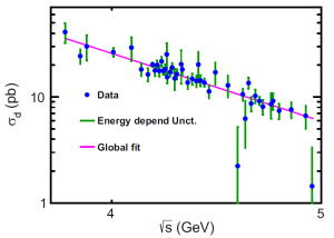 粲偶素是研究非微扰量子色动力学的理想场所。4 – 5 GeV能量区间存在多个(类)粲偶素共振态,对它们衰变到轻强子末态过程进行研究可以用来验证不同的理论模型。对e^+ e^- à f_1(1285) pi^+ pi^-这一轻强子末态过程的产生截面进行测量,并对4 – 5 GeV能量区间内(类)粲偶素衰变到f_1(1285) pi^+ pi^- 的可能性进行研究,可为非微扰量子色动力学理论研究提供重要的数据基础。另外,轴矢量的跃迁形状因子在缪子反常磁矩理论计算中强子光-光散射贡献部分至关重要,而e^+ e^- à f_1(1285) pi^+ pi^- 过程的精确测量可为获取轴矢量跃迁形状因子提供数据输入。本文利用BESIII探测器采集的质心能量3.808 – 4.951 GeV范围内的e^+ e^-对撞数据进行分析,涉及45个能量点共计500亿数据量,研究工作测量了各个能量点处e^+ e^- à f_1(1285) pi^+ pi^- 过程的产生截面。对于3.808 – 4.550 GeV区间相比于以往实验,本文测量精度提高了2倍,对于4.550 – 4.951 GeV区间,本文研究结果是该过程的首次测量。对e^+ e^- à f_1(1285) pi^+ pi^- 产生截面线形状进行仔细研究,没有发现明显共振态结构,已知共振态衰变到f_1(1285) pi^+ pi^- 的显著度很小,该结论表明(类)粲偶素衰变为轻强子末态f_1(1285) pi^+ pi^- 的概率较小,这为理解(类)粲偶素内部结构和衰变动力学机制,以及非微扰量子色动力学理论提供了重要的实验数据。